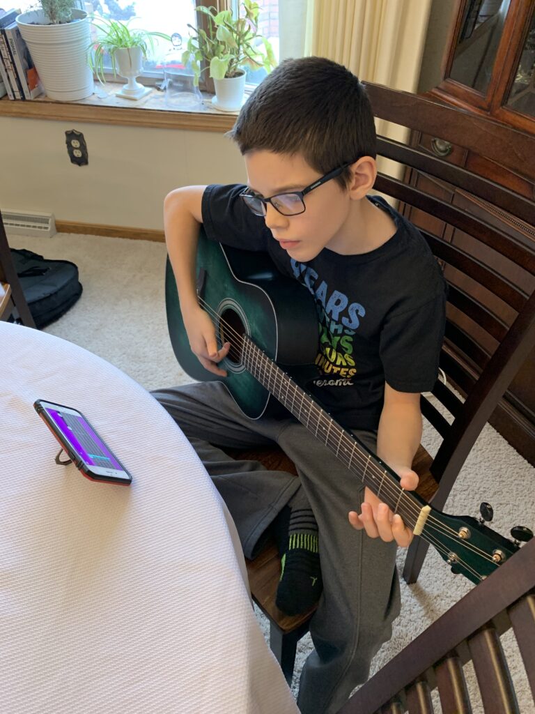 Landon practices his guitar a few times each week using an app called Simply Guitar and 1:1 guitar lessons with an in person music instructor. He has gone from just learning individual chords to playing excerpts from well-known rock/pop songs in just one year.