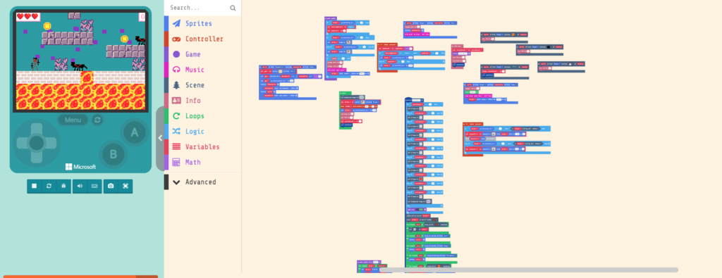 This game is called “The Impossible” and he used Microsoft MakeCode Arcade to code this first attempt at video game creation. Play the game below (may take a moment to load) by using the keys, A, D, Spacebar, and Enter or use the mouse to click on the button features. Good luck!
